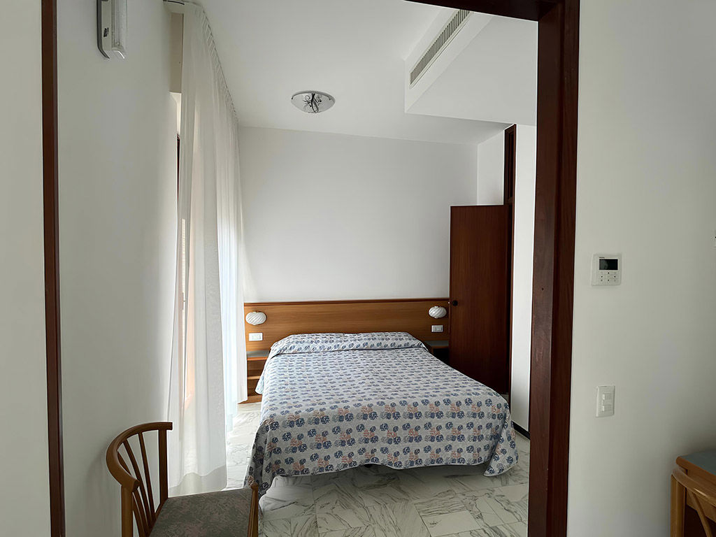 All'ingresso si trova un armadio con una cassaforte all'interno. Il piccolo spazio (antibagno) che precede la camera rappresenta una vera e propria “zona filtro”, contribuendo a un perfetto isolamento dal corridoio comune esterno. Il pavimento è in marmo come in origine, mentre l'arredamento è sobrio, in legno e minimale ma con la dovuta attenzione ai dettagli, alla praticità e all'igiene. Camera non fumatori.